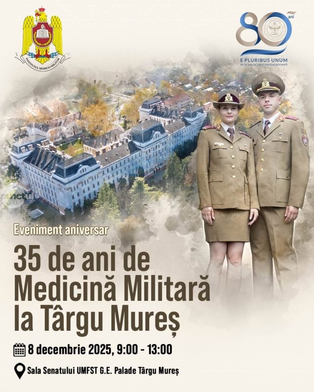 Universitatea de Medicină, Farmacie, Științe și Tehnologie „George Emil Palade” din Târgu Mureș și Secția de Pregătire Medico-Militară Târgu Mureș anunță organizarea unui eveniment dedicat aniversării a 35 de ani de Medicină Militară la Târgu Mureș. Evenimentul va avea loc în data de 8 decembrie 2025, interval orar 9:00-13:00, în Sala Senatului a UMFST G.E. Palade Târgu Mureș (str. Gh. Marinescu, nr. 38, clădirea centrală, etajul 2).Acest eveniment aniversar, organizat sub egida Zilelor UMFST, ne oferă prilejul de a celebra, alături de distinși invitați și comunitatea academică, un moment simbolic de recunoaștere a tradiției învățământului medico-militar la Târgu Mureș, a unei duble vocații: cea de medic și cea de militar, precum și a devotamentului față de o profesie care implică responsabilitate, disciplină și spirit de sacrificiu.