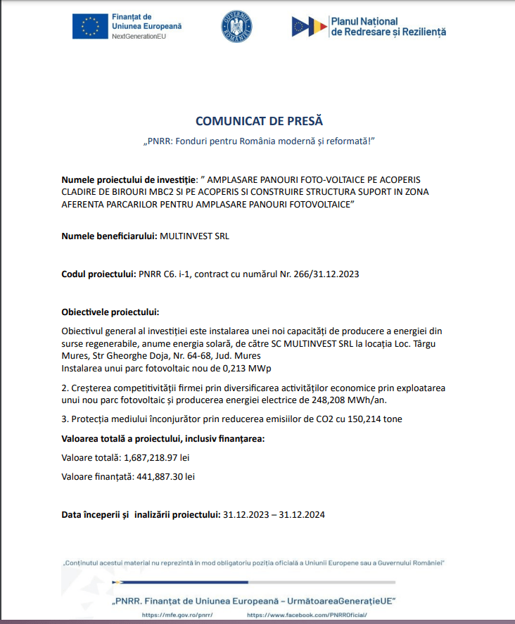 Comunicat de presă: AMPLASARE PANOURI FOTO-VOLTAICE PE ACOPERIS CLADIRE DE BIROURI MBC2 SI PE ACOPERIS SI CONSTRUIRE STRUCTURA SUPORT IN ZONA AFERENTA PARCARILOR PENTRU AMPLASARE PANOURI FOTOVOLTAICE”