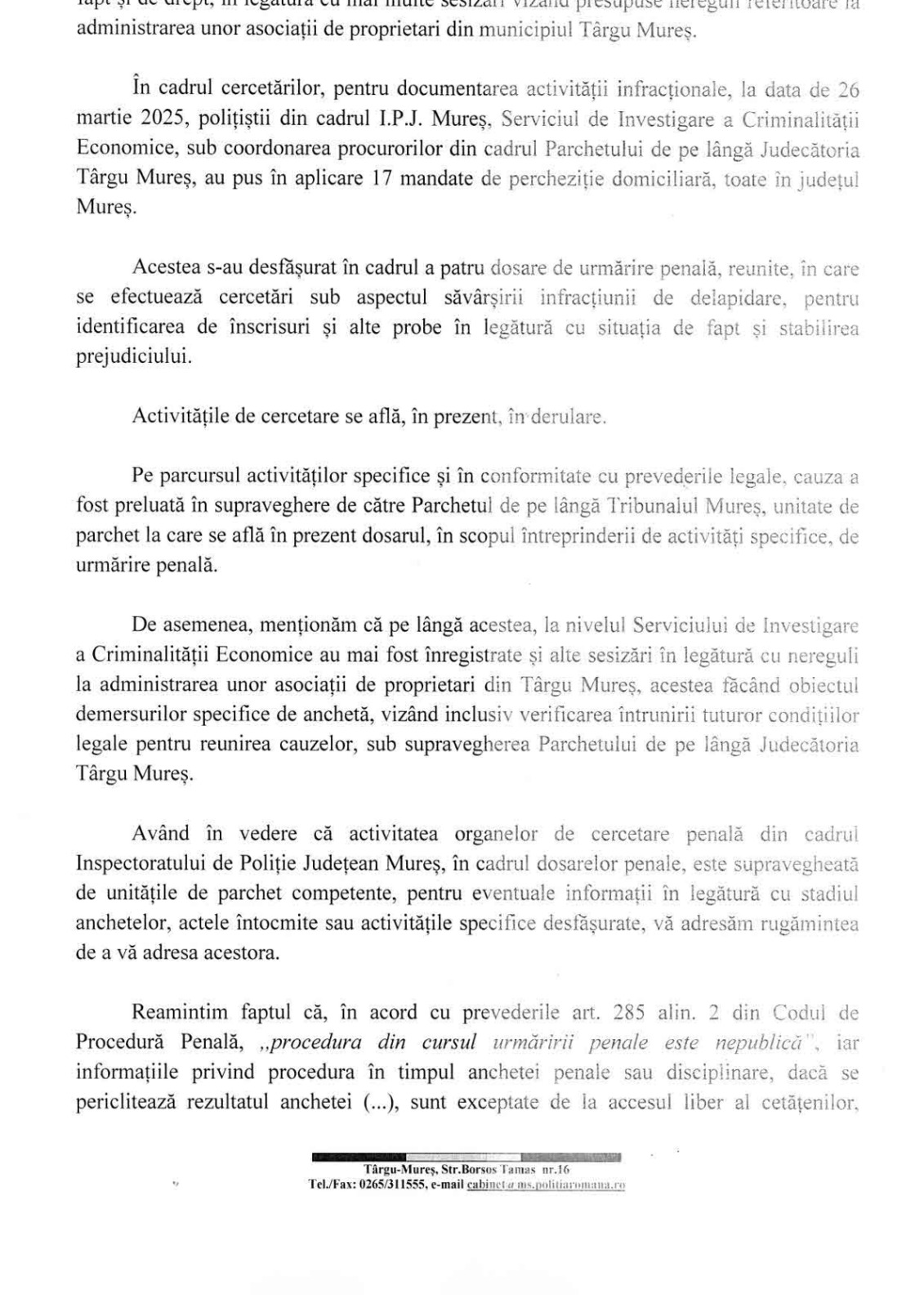 Inspectoratul Județean de Poliție Mureș și acum în etapa a doua de cercetări Parchetul de pe lângă Tribunalul Mureș ne spun că încă nu se știe cine e autorul unor infracțiuni de ”delapidare în formă continuată” și ”fals în înscrisuri sub semnătură privată în formă continuată”. Cercetările sunt ”in rem” pentru că încă nu e clar autorul. Vă dăm un pont: Novac Răzvan. Începeți cu el.