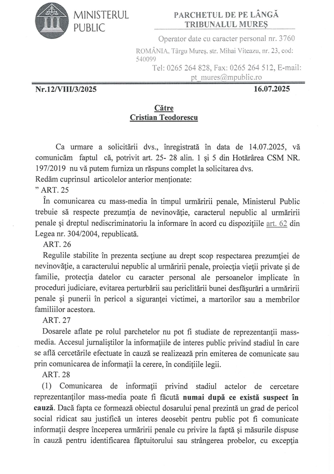 Vă redăm mai jos în totalitate răspunsurile celor două instituții și vă rugăm frumos pe cei care sunteți ”parte vătămată” să depuneți solicitări, cereri și petiții la cele două instituții pentru a o impulsiona pe doamna procuror să-și întrerupă pauzele dese și să bage în priză dosarul care afectează – repet încă o dată – peste 6.000 de familii din oraș.