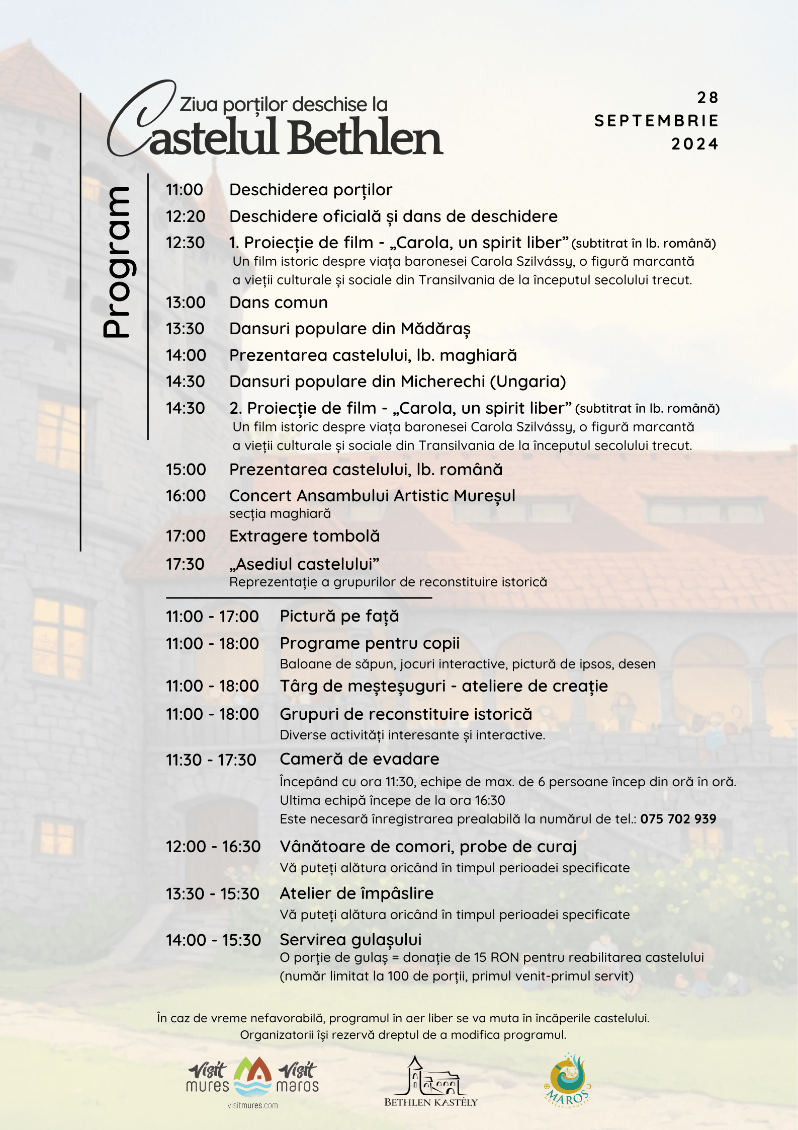 Asociația Visit Mureș, în parteneriat cu Ansamblul Artistic Mureșul și Castelul Bethlen, va organiza în data de 28 septembrie 2024, cu ocazia Zilei Mondiale a Turismului 2024, evenimentul „Ziua porților deschise la Castelul Bethlen din Criș”, care va fi găzduit de Castelul Bethlen din Criș.